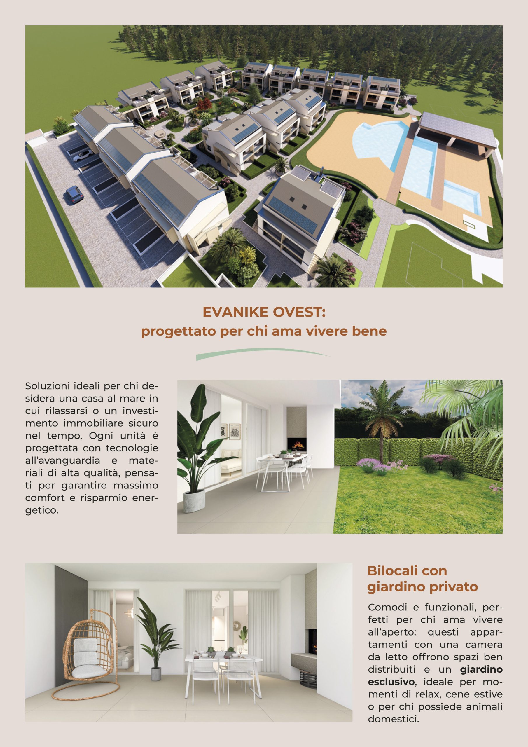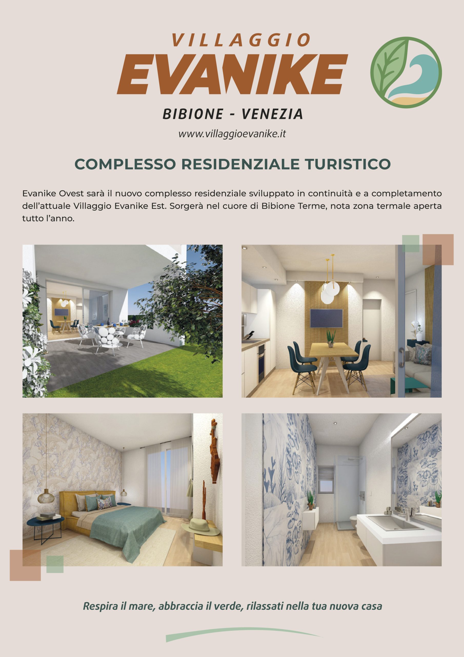 Collocato nella zona delle terme, tra il verde della pineta e tutti i servizi offerti dalla zona pedonale, sorgerà un nuovo e moderno villaggio composto da 60 unità abitative che proponiamo in vendita. Il complesso, denominato Evanike Ovest, offrirà due tipologie di alloggio: bilocali al piano terra con giardino di proprietà oppure quadrilocali disposti su due livelli con ampie terrazze. Gli appartamenti saranno realizzati con le più innovative tecniche e con materiali di prima scelta per garantire assoluto comfort ed efficienza energetica, con particolare riferimento agli isolamenti termici ed acustici ed agli impianti tecnologici. Ogni unità immobiliare sarà realizzata in classe energetica A4 e disporrà di impianto di raffrescamento autonomo ed impianto fotovoltaico per la produzione di acqua calda. Gli alloggi posti al piano terra saranno composti da soggiorno con angolo cottura, una camera da letto e bagno, oltre al giardino di proprietà fronte e retro dotato di zona barbecue in muratura. I quadrilocali saranno invece composti da un’ampia zona giorno con terrazzo e caminetto, camera da letto matrimoniale con terrazzo privato e bagno al primo piano; il piano sottotetto sarà collegato da una scala interna ed ospiterà una camera da letto doppia con terrazzo, un’ ulteriore locale da poter sfruttare come terza camera, cabina armadio o ripostiglio oltre ad un secondo bagno. Tutti gli appartamenti saranno consegnati completi di un garage al piano interrato. La consegna è prevista per la primavera 2026, ti aspettiamo nella nostra agenzia per una vista al cantiere e per tutte le informazioni. Prezzi a partire da € 290.000,00 oltre iva.