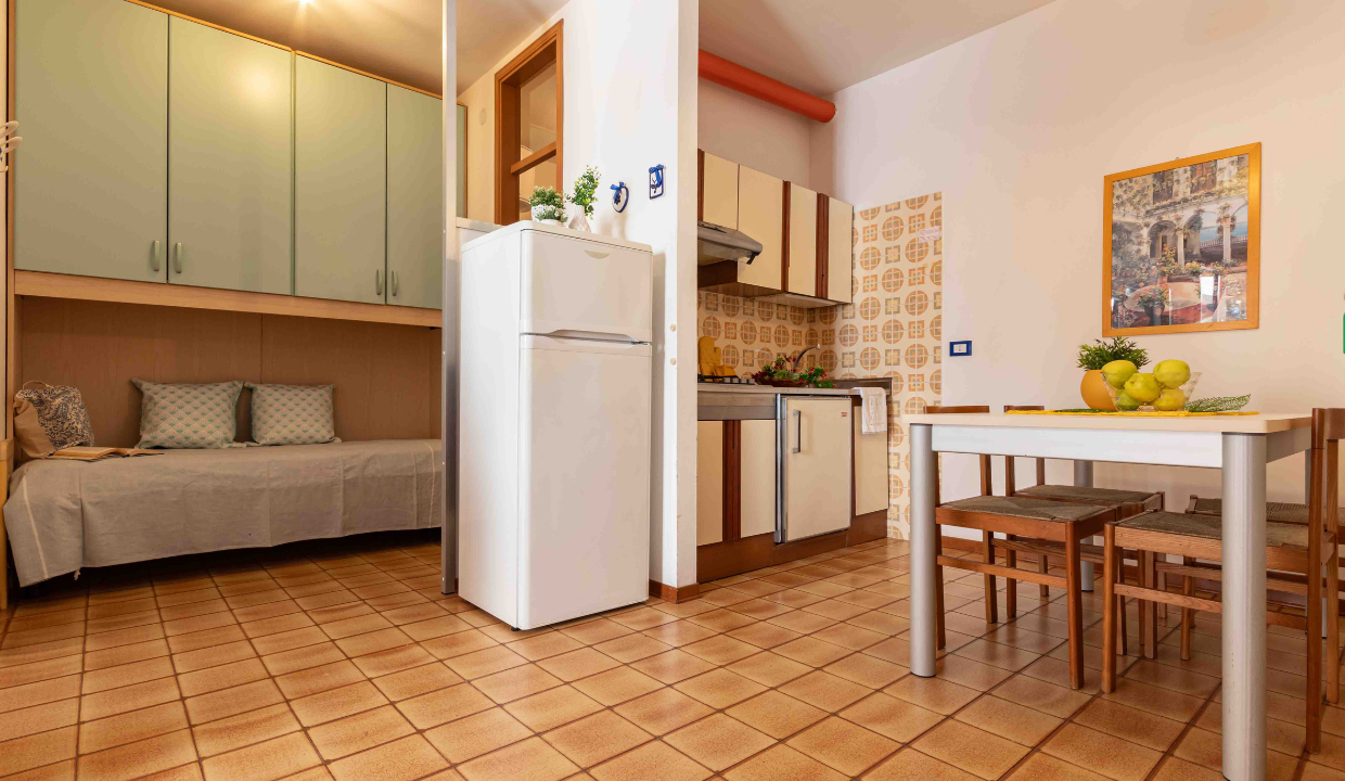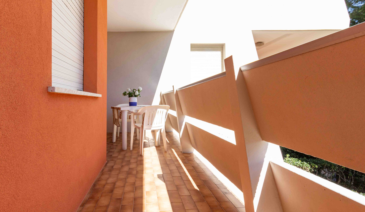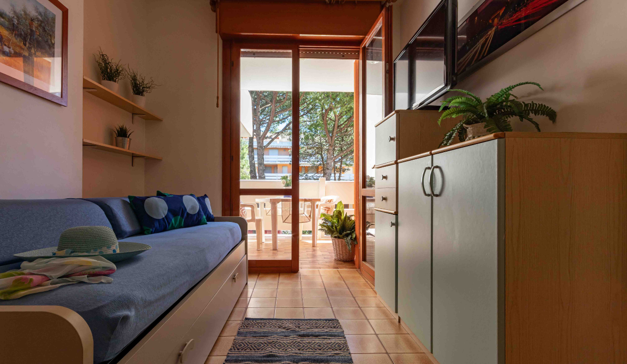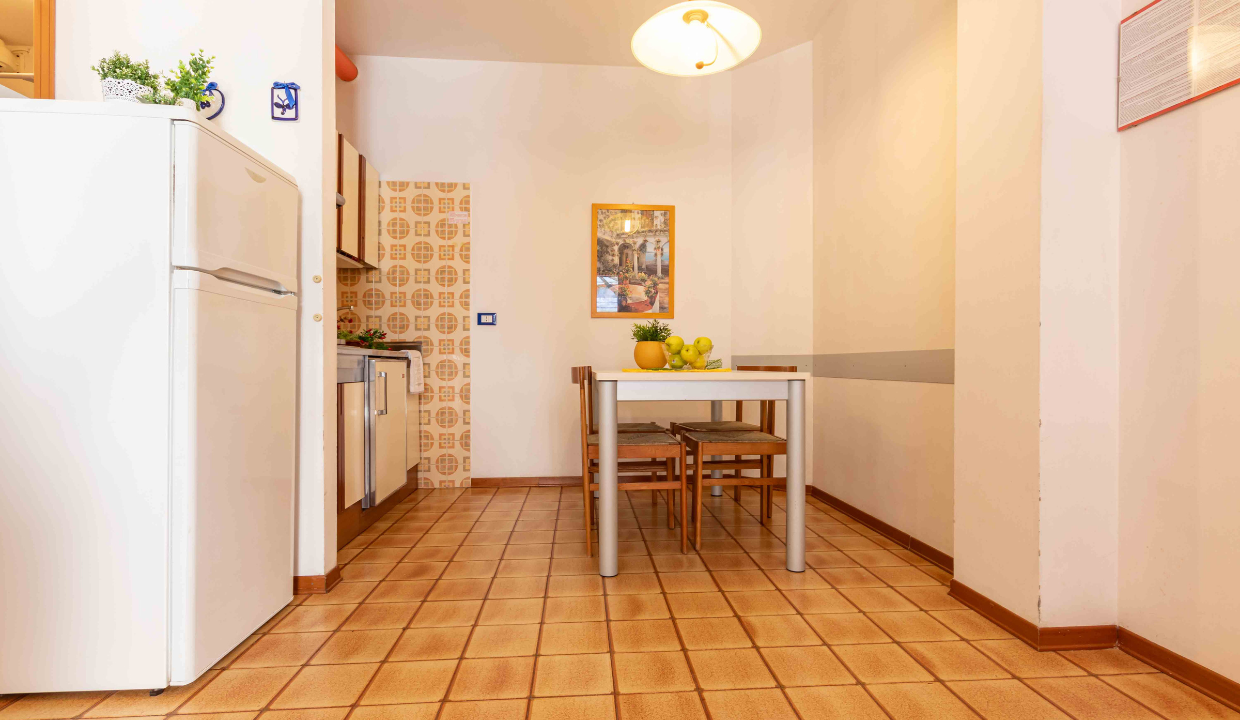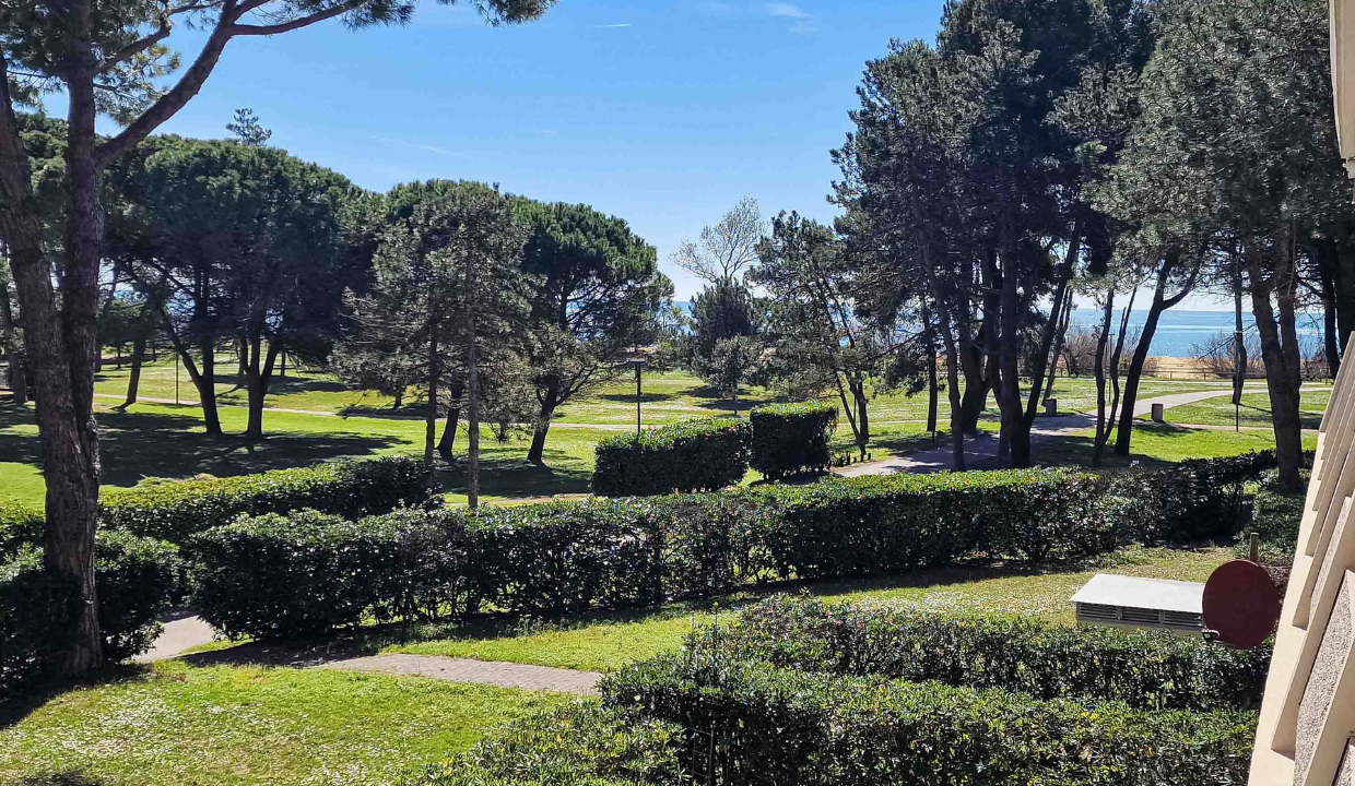 L’appartamento in vendita è situato al primo piano e si accede dalla zona giorno con angolo cottura e divano letto doppio, che conduce all’ampio terrazzo coperto orientato ad est con vista sugli ampi spazi verdi da cui si ergono i pini marittimi, icona della località balneare, antistanti la struttura. Dal corridoio si accede alla camera matrimoniale e al bagno con doccia. Poso auto coperto.