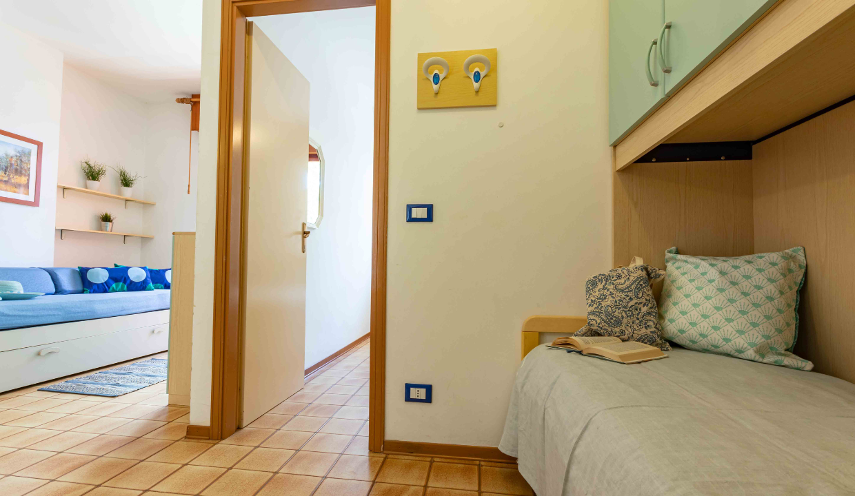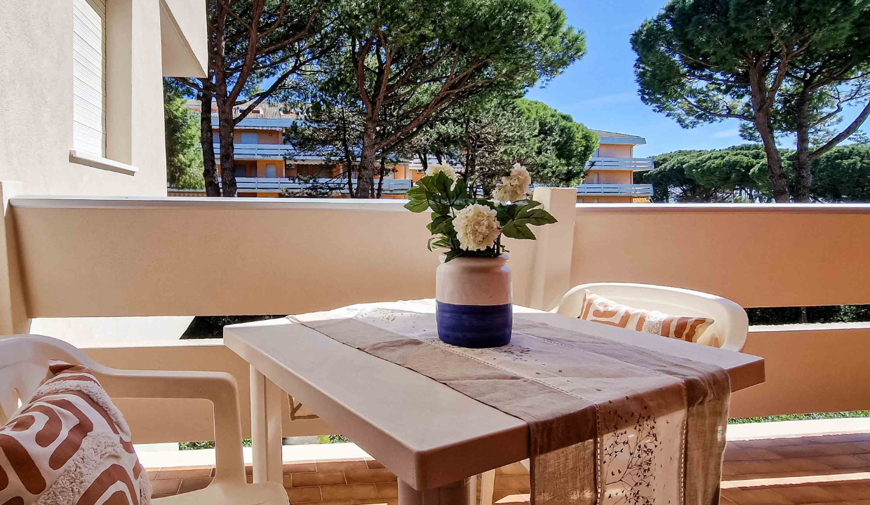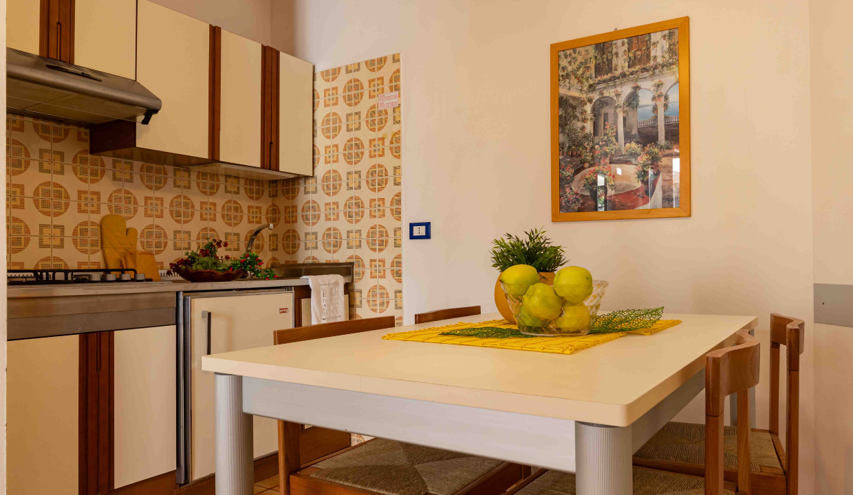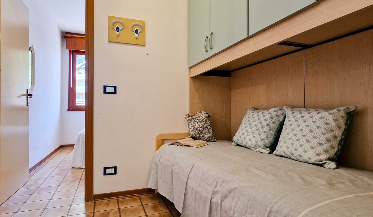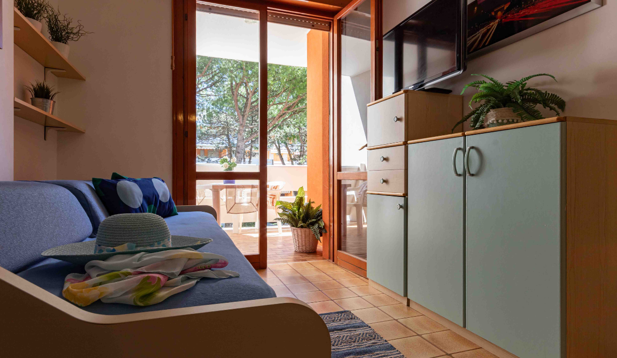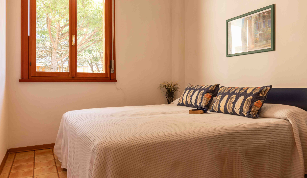 L’appartamento in vendita è situato al primo piano e si accede dalla zona giorno con angolo cottura e divano letto doppio, che conduce all’ampio terrazzo coperto orientato ad est con vista sugli ampi spazi verdi da cui si ergono i pini marittimi, icona della località balneare, antistanti la struttura. Dal corridoio si accede alla camera matrimoniale e al bagno con doccia. Poso auto coperto.