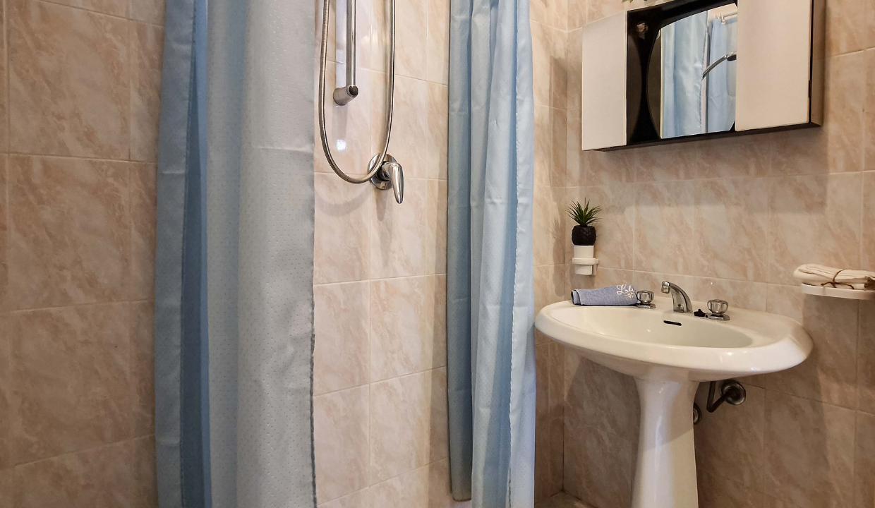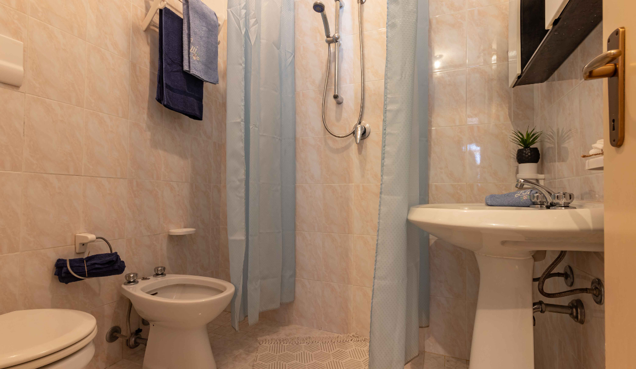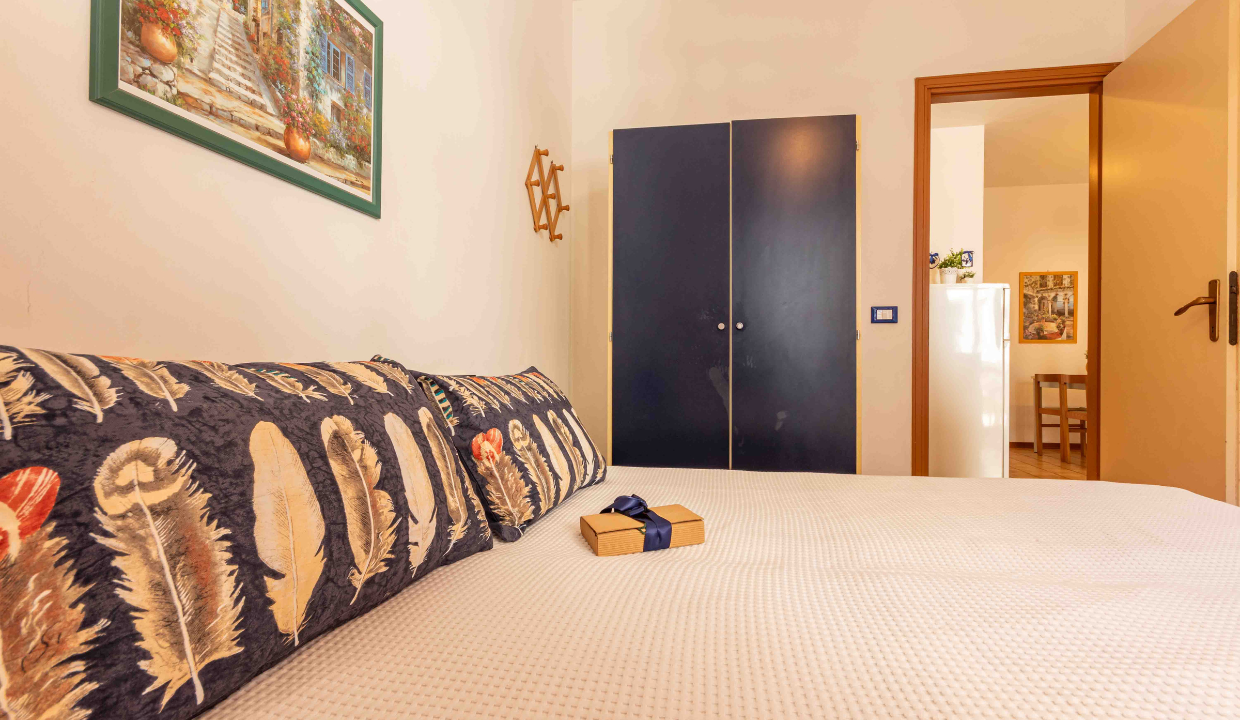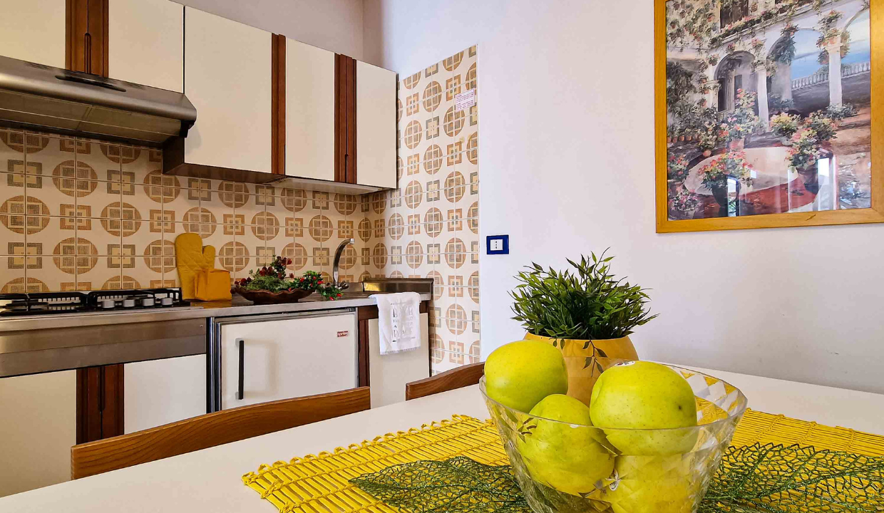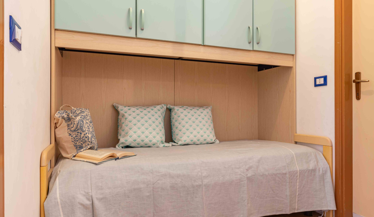 L’appartamento in vendita è situato al primo piano e si accede dalla zona giorno con angolo cottura e divano letto doppio, che conduce all’ampio terrazzo coperto orientato ad est con vista sugli ampi spazi verdi da cui si ergono i pini marittimi, icona della località balneare, antistanti la struttura. Dal corridoio si accede alla camera matrimoniale e al bagno con doccia. Poso auto coperto.
